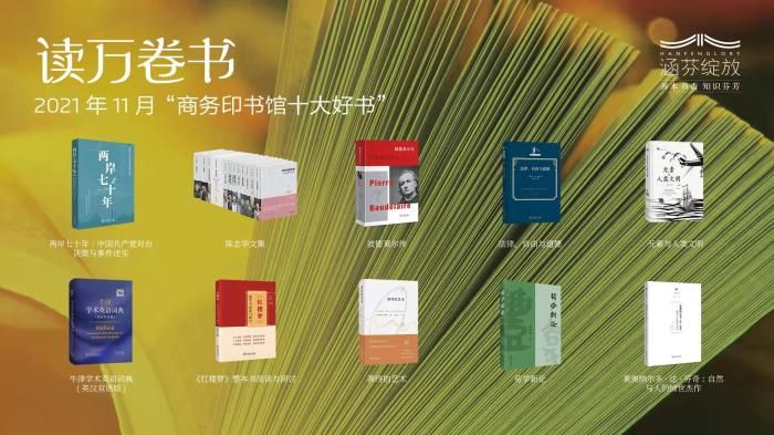 2021年11月“商务印书馆十大好书”8日晚在直播间发布,《两岸七十年:中国共产党对台决策与事件述实》《陈志华文集》《波德莱尔传》《法律、自由与道德》《元素与人类文明》《牛津学术英语词典(英汉双语版)》《<红楼梦>整本书阅读与研讨》《善终的艺术:应对衰老、病痛、死亡的实用指南》《荀学新论》《莱奥纳尔多·达·芬奇:自然与人的惊世杰作》入选。