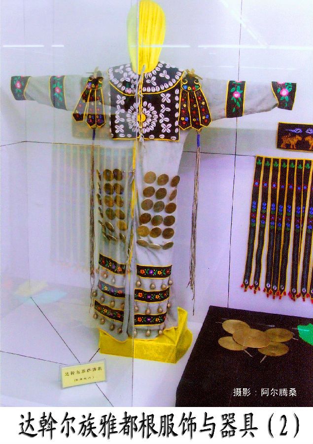 达斡尔族雅德根服饰有多种不同的形式,它们基本上反映了萨满文化不同历史时期的不同特征。雅德根的神衣,是用熟皮制的长袖对襟长袍,配有两层背裙,外套一坎肩。领口至下摆钉有8个大铜纽,象征城门。左右袖筒及下摆各佩3条黑大绒,以示雅德根之四肢八节,左右襟中部、下摆的6条大绒上各钉有小铜铃,象征木城之墙。背悬一大四小五个铜镜,胸前佩一中型铜镜,两肩各立一小鸟,上下两层背裙各有12条飘带,上层代表12个“杜瓦兰”(神树和飞禽),下层象征12个月。帽子顶有鹿角饰,鹿角间有展翅欲飞的鹰塑像,两侧绣有虎形。帽额下垂饰一排遮住双眼的彩布辫绳,似“流海”形。