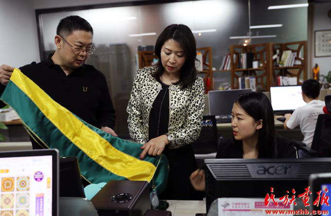 孔丽(中)是来自云南德宏的景颇族,她的公司致力于将少数民族优秀文化与商业相结合,这是她在与公司员工商议产品设计方案(和勇 摄影)