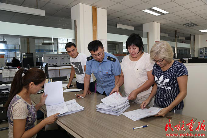 中哈两国铁路人员在阿拉山口口岸进行货物交接验收(滕俊 摄影)