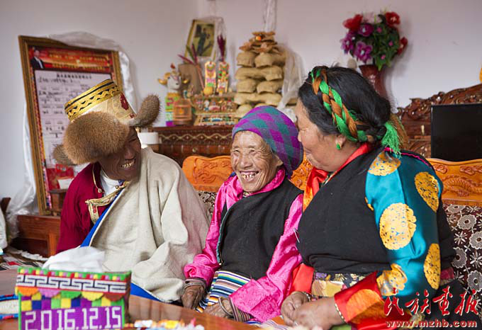 村民尼玛一家,前排的编织物记录了他们搬迁新居的日期(黄若天 摄影)