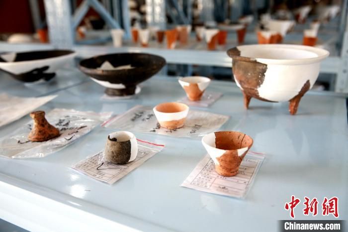 考古人员展示新发掘出土的“蛋壳陶杯” 杨东 摄