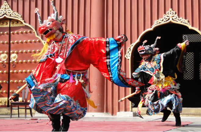 内蒙古地区的查玛乐舞已与藏族地区的“羌姆”明显不同。随着藏传佛教传入蒙古地区后,积极地吸收和融合了蒙古族传统音乐舞蹈和萨满教神舞的因素后形成了蒙古化的查玛乐舞。因此,内蒙古地区的查玛具有复合型和多元性特点。2008年,查玛乐舞被列入国家级非物质文化遗产。