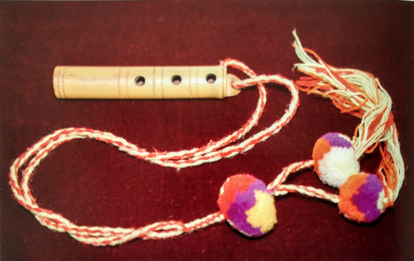 直笛,傈僳语称之为“迪哩吐”(如图),多用芦苇制作,长约5寸,有4个圆孔,3孔在正面,1孔在背面,音量较小,音色柔和动听,为青年男女抒情和求爱必要的工具。