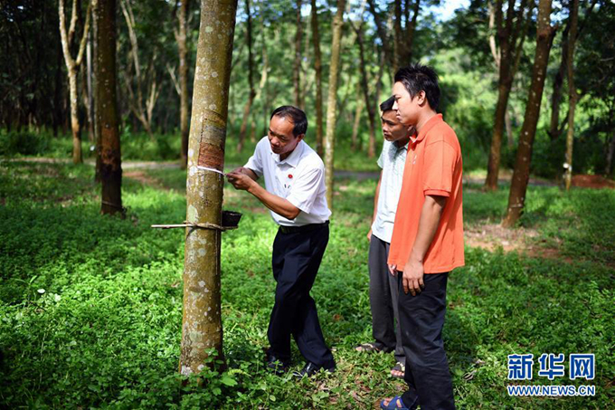 羊风极(左)在海南省白沙黎族自治县打安镇田表村指导年轻人割胶