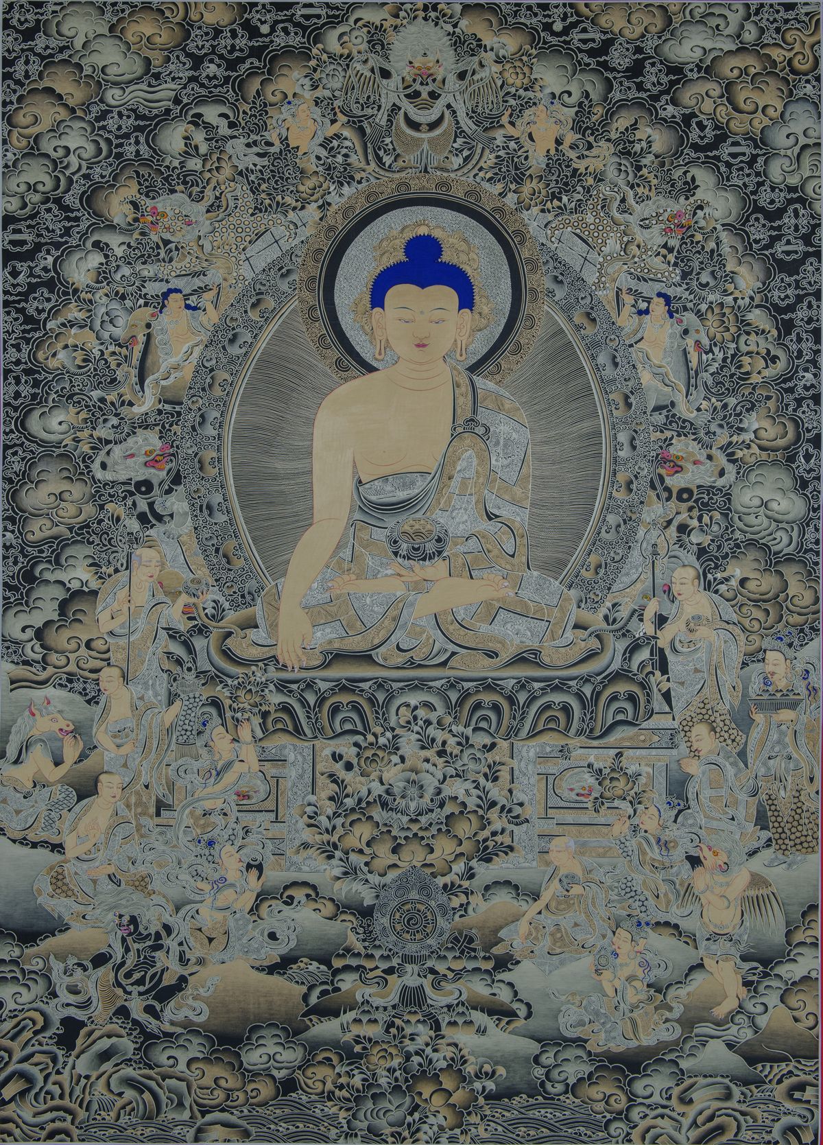 此唐卡是夏吾尖措画家通过几个月的辛勤劳作制成的又一大师级巨作。其制作工艺、颜料调配法都是夏吾家族几代画家传承下来的绝世密法。原料也都是由祖先留下来的黄金用传统秘方磨成水粉之后画家用调好的黄金粉进行画布上勾勒主尊释迦牟尼佛祖,四周供奉为佛祖五大比丘,侨陈如、马胜、婆沙波、大名、和跋提听法灌顶。左右供奉为两大梵天菩萨、国王、大上师等在传授佛祖的初转法轮场景,大护法在莲花宝座下庇护恶魔降妖,背景用花鸟、山水、祥云等线条来衬托整个画面的层次与审美。