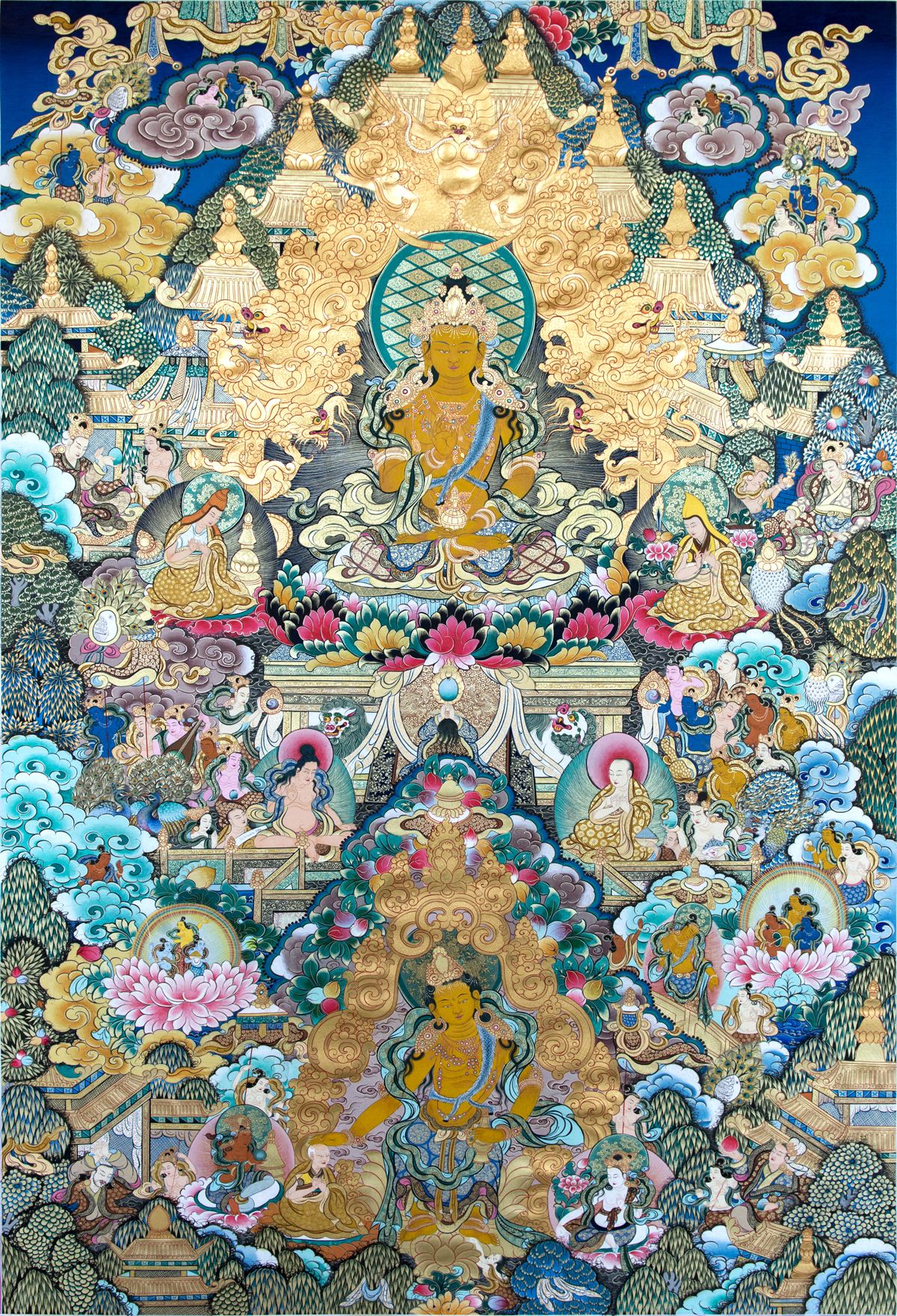 主尊未来世界弥勒佛菩萨,左边描绘了噶当派创世者阿底峡尊者与他的弟子。右边描绘了格鲁派的创世者宗喀巴大师与两大弟子克主杰和迦侧杰,中部周围供奉者八大随喜菩萨文殊菩萨、普贤菩萨、观世音菩萨、金刚手菩萨、虚空藏菩萨、地藏菩萨、弥勒菩萨、除盖障菩萨,画面四角供奉为弥勒佛未来世界的迎接与弘扬佛法的情景。画面上空描绘了仙女四处飞扬,空中漂浮着吉祥的图案与神秘的瑞相等等。整体画完之后选择一个殊胜吉祥的日子点所有诸佛的五官,发髻、手势、法器、画面后部画家要亲自写声、语、法的字号。作品完工之后寺院里进行众多活佛和高僧大德的加持与开光仪式。