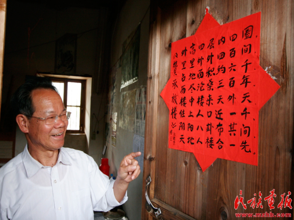 当过小学老师的江进荣为游客介绍承启楼,还专门写了首诗