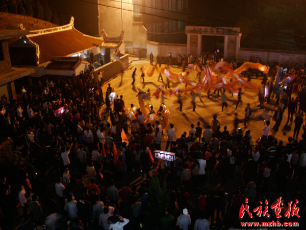 晚上十点半,在农村,这已经可以算作深夜了。但承启楼门前依然聚满了人,其他地区舞龙队的不断光临让这里也是鞭炮声不断。虽然累,从高南返回承启楼的舞龙队队员们依然兴奋不已,他们在楼前的马路上拦住过往的其他村舞龙队,要求共舞一场。