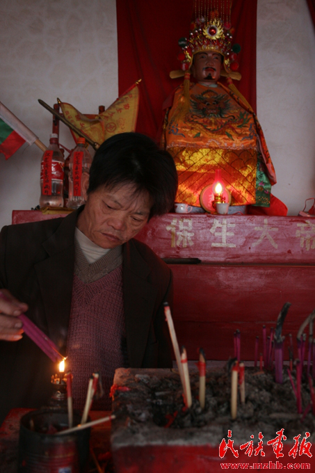 两年来,作为保生大帝庙守庙人,江云山早上起来最重要的事情就是打开庙门,给诸神上香,敬茶。除了保生大帝神外,庙里还供奉有关公和文昌君。人们一般向关公神祈求发财,向文昌君神祈求儿女考上大学,早日成才。江云山说,只要真心信奉,人们来年各方面的愿望都会得到神灵的保佑。