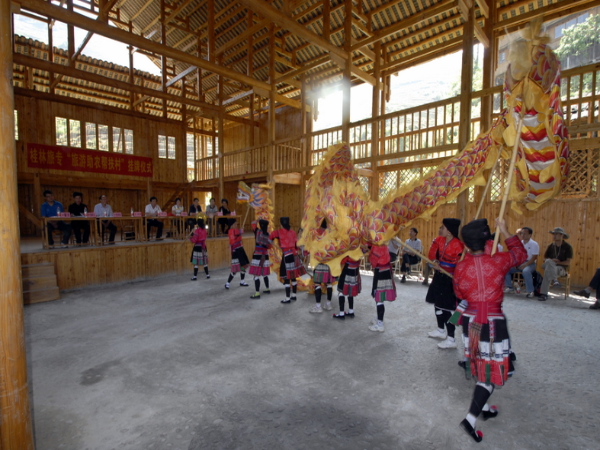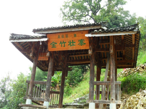 金竹壮寨1992年曾被联合国教科文组织号称"壮寨的楷模",2007年被评为中国首批"中国景观村落",2014年获得国家民委命名首批"中国少数民族特色村寨"。金竹壮寨的吊脚楼建筑风格独特保持得比较完整,这里具有壮族魔伊大王图腾、壮族连屋、古老寨门、石龙身、民族文化馆、民族歌舞坪、百年古枫树、百年古井、百年古杉树群等……,诉说着百年的壮族沧桑历史。这里可以听到优美动听的山歌,壮族人民很好客,吃饭时,就可品尝到清朝皇室贡品"龙脊茶"和被西方人称为"东方魔水"的龙脊水酒,以及壮家五色糯饭。金竹民族风味餐竹筒蒸鸡、竹筒糯饭和清一色的竹杯、竹碗餐具,村民们多会唱上敬酒歌劝酒,在您酒酣面热之际,一群着装典雅的壮族姑娘会端起一杯杯龙脊水酒,唱上那流传了几代人的壮族敬酒歌。歌词大意是:"小路路弯弯石板青,壮家姑娘迎贵宾,淡酒淡菜来招待,深表壮族一片心。"您若是接下酒杯一饮而尽,壮姑们还会接着为你唱上:"龙脊水酒清又清,水酒含来敬贵宾,请你接杯把酒饮,祝你越活越年轻。"您若是酒量好的话可站起来说"干了"!我教您怎么用壮话来说"干了"二字:"啰虽"。在这一唱一答之间会增加和壮族人民的感情和友谊,还可以让你真实的感受到原计原味的壮族风情。