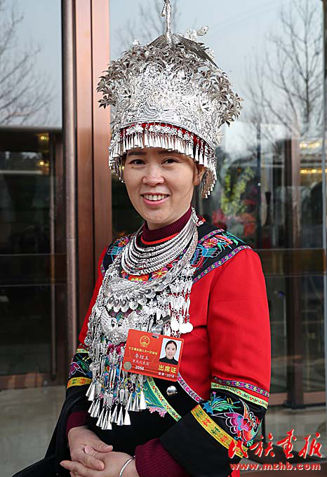 “头顶高高的银饰,脖子上一圈圈精美的项圈,走起路来叮当作响,来自重庆市彭水苗族土家族自治县的全国人大代表李绍玉(苗族)的这一身穿戴,一出现就很抓人眼球。再细看,这一身大红的苗族传统衣装上,胸前、袖口还有繁复精致的刺绣。