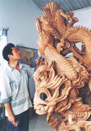 今年54岁的李元生,以雕龙而远近闻名。早在上个世纪80年代初,他创作的第一件根(木)雕作品《困龙也有上天时》,便被一位游客购买收藏。在近20年的时间里,一些常人眼里只能当柴烧的树根,在他独特的构思和飞舞的刻刀中,变成了上百件大小不一的富有生命力的根(木)雕作品。其中的代表作有:《九龙传说》、《送子观音》、《长寿九千年》、《金龙献宝》、《哪吒闹海》、《1999——人与自然》等。这些作品,不少被省内外的单位和个人作为珍品收藏。