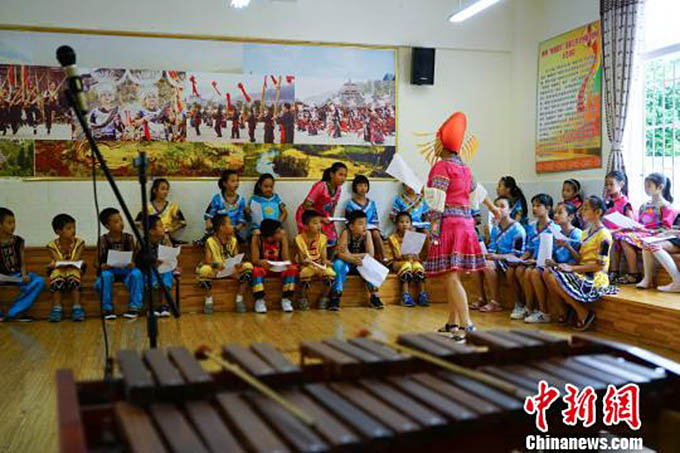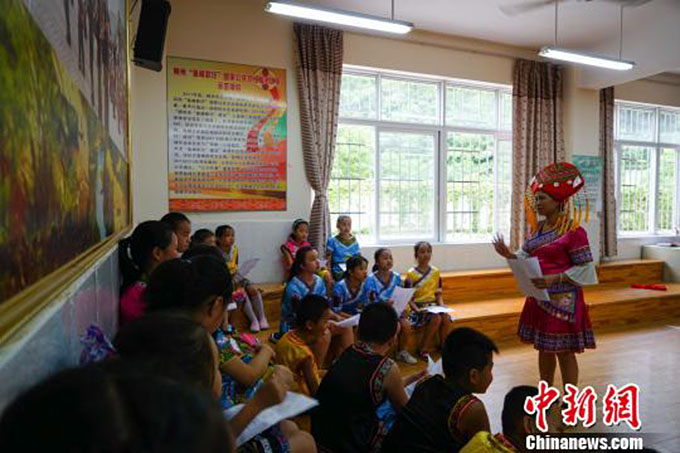 广西“山歌王”陆连芳给孩子们上课( 林馨 摄影)