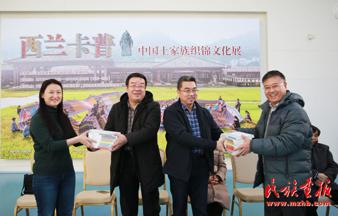 在随后举行的赠书仪式上,鲁迅文学院副院长邢春、培训部主任王冰代表鲁迅文学院向中国民族博物馆和中国妇女儿童博物馆分别赠送了《中国少数民族文学作品丛书》(全18册)。这套丛书收录了鲁迅文学院历届重点培养的王志国(藏族)、阿慧(回族)、孙永斌(蒙古族)、阿卜都热苏里·塔什(柯尔克孜族)等18个少数民族作家的代表作品。本展策展人中国民族博物馆展览部主任覃代伦把这场少数民族作家观摩活动比喻成1645年前书圣王羲之召集42个东晋名士的“兰亭雅集”,他寄语少数民族作家们寻找土家人失落深山的文化情怀,笔下生辉,写出更有温度与情怀的作品来。