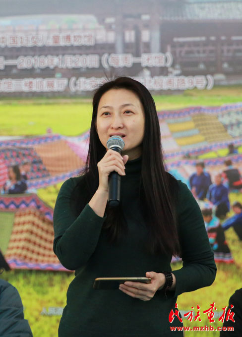 会上中国民族博物馆党委副书记、副馆长张志文向少数民族作家们介绍了展览,他说:“土家族是一个历史悠久的民族,现在有835万人口。土家织锦也有两千多年的发展历史,有250多种传统图案,是中国民间五大织锦之一,堪称中国服饰文化中的奇葩。中国民族博物馆从历年征集收藏的300多幅清代以来的土家织锦中,选取了156幅精品土家织锦、21分钟传承人视频和120余幅土家民族风情照片。我们和中国妇女儿童博物馆合作举办了这个高品质的专题展,旨在传承和弘扬土家族国家级非物质文化遗产。”
