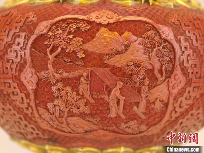 本次展出的乾隆款剔红开光山水人物纹龙耳瓶为乾隆年间制作,是漆器与金属工艺相结合的产物。乾隆时期,国力昌盛,加之乾隆帝本人的喜好和干预,造办处使用“牙作”匠人承担漆器雕刻,因而器物画面带有雕工精致、层次丰富、转角凌厉的锋棱之美,且纹饰寓意吉祥美好,还常常与描金、镶嵌等工艺相结合。