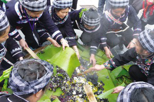 布依同胞正热情地为各位嘉宾、朋友备送布依“三月三”花米饭