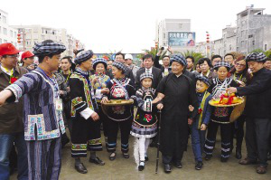 望谟布依寨老和小朋友迎接各位领导、朋友、嘉宾进入活动会场