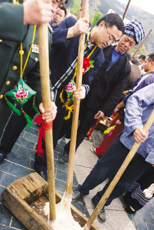 黔西南州委书记陈鸣明(中)与布依族同胞在活动现场打糍粑