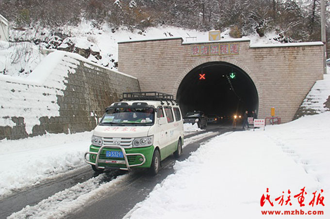 2014年4月独龙江公路高黎贡山隧道贯通,农村客运车辆在铺满雪花的路上驶进驶出
