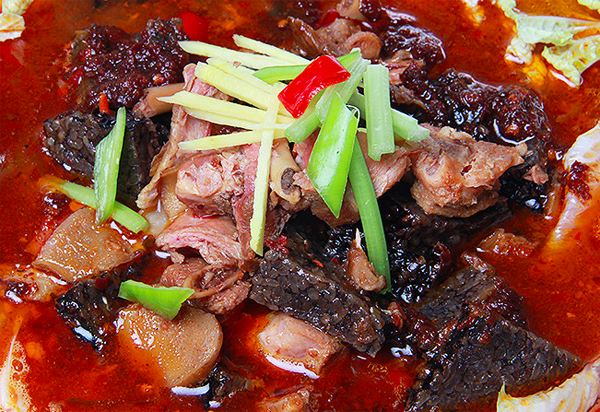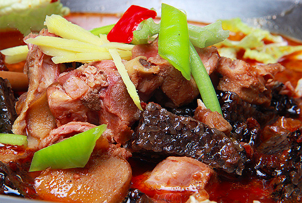3、大约炖至90分钟左右后,肉熟骨烂把已炸好的血粑及新鲜红辣椒一起倒入鸭肉内,再用高火炖5至10分钟,即可食用。