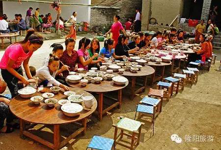 男方家也得请客。新郎启程去接新娘子,家里马上就杀鸡做饭,新郎新娘回来后要吃染成黄色的糯米饭和鸡肉,表示往后生活美满幸福,像糯米饭一样结成团永不分开。晌午时分,是新郎家待客最热闹的时候,帮厨的人摆上各种酒菜,亲朋寨邻老老少少全坐到天井里,欢欢闹闹地吃饭。最后,客人们有的陆续走了,愿留下的凑拢几桌,边喝酒边畅谈,一直要吃到第二日还不歇。