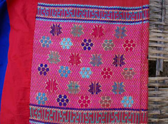 三角钩锄是毛南族特有的生产工具,毛南语叫“拱”。它小巧轻便,适合在鸡窝地里中耕锄草,又用于点种黄豆。种黄豆还有一种木制的“点穴锤”,用8寸到1尺长的金刚木削成圆杆,形如擀面杖,中间插一木柄,手握木柄在泥土里一锤,就成一个如鸡蛋形的坑,即可放入黄豆,盖上草木灰。这种“点穴锤”一锤一穴,工效很高,是种黄豆的最佳农具。此外还有禾剪、割烟刀等(图为毛南族织锦)。
