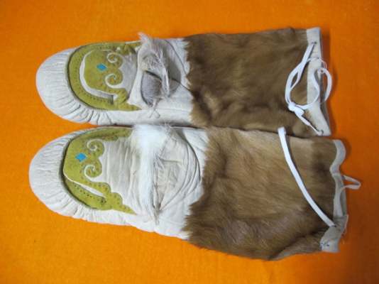 此外鄂伦春人还有被称为“瓦拉开依”的手套,它和北方人做的棉手闷子一样,是拇指同其他四指分开的手套,手心处无开口,戴这种手套可以保暖,也可以拿比较笨重粗大的东西,但不能射猎。另一种被称为“沙拉耶开依”,是五指手套,即五指分开,戴这种手套拿东西或射击都很方便,但保暖性能差,多为青年人喜爱和佩戴。鄂伦春人冬季出猎,一般还是喜欢戴“考胡鲁”。以上三种手套多用狍皮制作,五指分开的手套也有用鹿皮制作的。