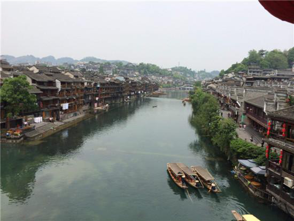 没有想象中的古老城楼,取而代之的是吊脚楼,街边整整齐齐坐着贩卖各种绣品、纪念品的苗家老人,再往里一点,见到便看见清澈的沱江,一阵清风吹来,有江水的湿气,亦有对面餐馆的饭菜香,过往的游客或在戏水,或在渡江,亦或摆出各种姿势拍照,我想,也许这就是新的生活方式,简单而温馨。