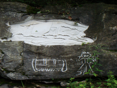 笔者在该村所见的具有“文化生态村”建设痕迹,除了村口巨石上镌刻的文字外,还修建了一条贯通项目组专家们规划的“文化生态展示区”的石板路,并在作为展示重要文化景观的地方竖立了介绍或解释性的文字标牌。如,村口、山神庙前、摔跤场等都立有介绍的招牌。让笔者疑惑和认为不应该“改造”的是在村民们的祖灵洞岩壁上的“艺术石刻”(见图)。从笔者与村民的访谈和项目组的总结报告资料中,可以把文化生态村建设试点项目组在月湖开展的文化保护工作归结为如下几个方面: