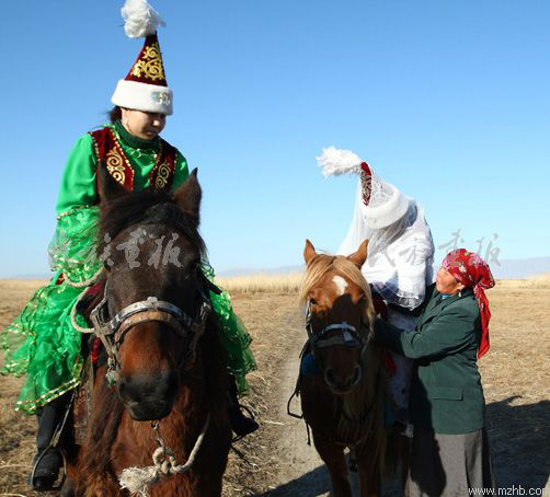 新娘唱完“阔尔斯”后,在伴娘的搀扶下,和亲人们一一拥抱,挥泪告别。新娘离家时,彩巾蒙头,出门吻别父母,骑上最快最好的马,同新郎并驾而行。遇有拦路的绳索,新娘必须下马,向拦路的小伙子赠送纪念品,否则,小伙子们会故意取闹不放行。
