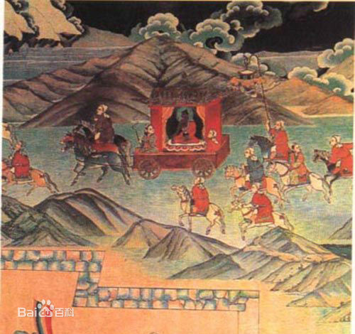 贞观15年(641)正月十五,唐太宗将文成公主下嫁松赞干布,诏令江夏王李道宗持节护送。文成公主在唐送亲使江夏王太宗族弟李道宗和吐蕃迎亲专使禄东赞的伴随下,前往吐蕃。文成公主一行从长安出发,途经西宁,翻日月山,长途跋涉到达拉萨。 松赞干布率群臣到河源附近的柏海(今青海玛多县境内)迎接文成公主,谒见李道宗,行子婿之礼。之后与公主同返逻些(今拉萨),为公主筑城、修建宫室。