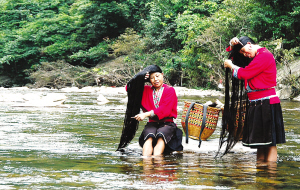 红瑶女子的长发平均在1.4米以上。村寨前后的河滩边、泉水边,就是她们的天然梳妆台