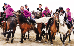 2014年5月2日,新疆克拉玛依市在乌尔禾乡举办了第三届少数民族传统体育运动会。在开幕式上,数万名各族市民和农牧民观看了克拉玛依市千余名各族退休职工表演的大型健身操。300余名来自维吾尔族、哈萨克族、蒙古族等民族的运动员,参加了赛马、叼羊、姑娘追、摔跤等活动。图为叼羊比赛现场。