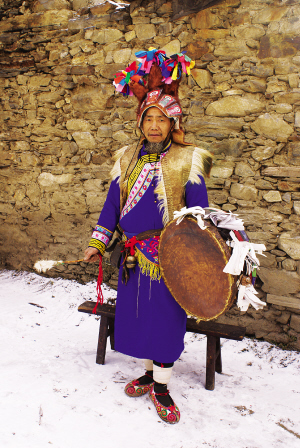 “释比”是羌族对宗教仪式执行者的尊称,汉语称之为“端公”,是羌族文化知识的集大成者。释比头戴的猴皮帽和手中的羊皮鼓现在已成为珍贵的民族文物
