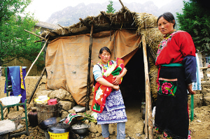 萝卜寨的杨芝群抱着刚出生3个月的婴儿在自建的地震棚前