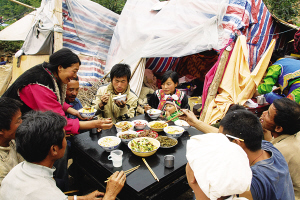 萝卜寨村民一家震后的晚餐  陈鼎波/摄