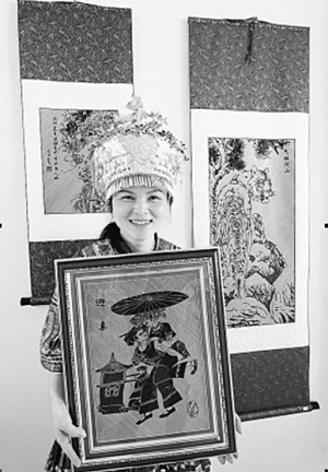 一幅幅人物肖像、书法作品、风景风情画,工艺精细,造型典雅,谁能想到,它们出自一群苗家留守妇女之手?