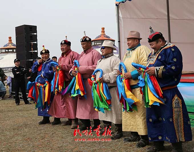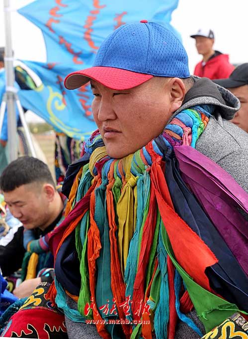 巴音昌呼格草原举行。图为被授予“将嘎”(彩带)的鄂尔多斯搏克们