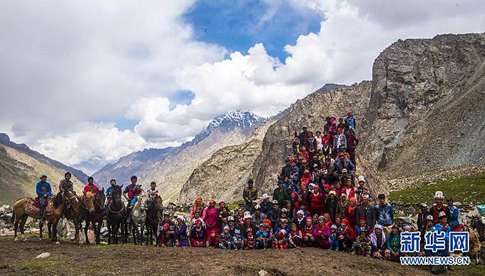 帕米尔高原慕士塔格峰脚下的新疆克孜勒陶乡喀拉塔什其木干村的村民在夏牧场合影