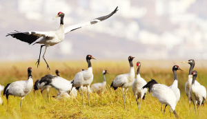 次日清晨,当第一缕阳光开始谱写草原晨曲时,橘红色的天际开始展现云彩的舞蹈,为黑颈鹤的亮翅布置了最美的舞台背景;新鲜的空气散播着白露的味道,也唤醒了草原的主人,唤醒了我们……