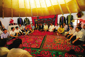 6月17日,在胡斯马义·沙胡马尔登陆南北极纪念碑揭牌仪式后,哈萨克族群众自发地跳起了欢快的舞蹈,而后大家又欢聚在毡房中,畅谈各民族团结和发展的问题。