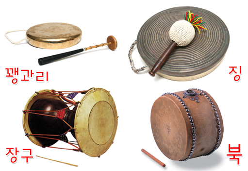 “四物乐”,朝鲜语为사물놀이。四物乐是由韩国著名民俗家沈雨晟先生命名的,20世纪90年代传入我国吉林延边朝鲜族自治州。“四物乐”由小锣(꽹과리)、锣(징)、长鼓(장구)、圆鼓(복)四种乐器演奏音乐,并且由此音乐来做游戏。每种乐器都是以大自然的声音来形成的。小锣象征风,长鼓象征雨,圆鼓象征雷,锣象征电。