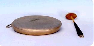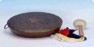 与小锣相似但比小锣要大,通常为面径70CM,边圈高10CM,边穿小孔,用绳索固定。演奏时,左手提绳,右手拿锤演奏;盘坐演奏时大锣悬挂在木架上,可以用手来控制音色,其声音洪亮、粗犷。