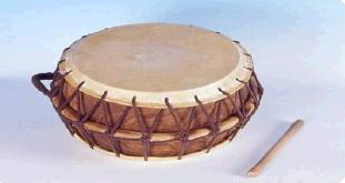 鼓框为木质,两面蒙皮,用绳索固定在木框两边。鼓链木质,通常在表演中负责敲击主要旋律的重拍,也有独奏的情况,声音有力。