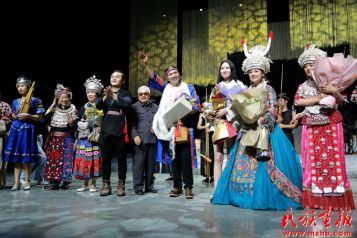 古朴的苗语、爵士的节奏碰撞出奇妙的艺术魅力。在第三篇章《未来的歌》中,《苗》《等待新娘》《NEW》《今宵醉》《苗岭谣》《走了一山又一山》《干一杯》等曲目依次精彩上演,激情的旋律将本场音乐会推向高潮,现场观众深受感染。在芦笙合奏《欢乐的苗家》欢快的旋律中,本场音乐会圆满落下帷幕。