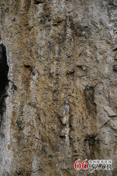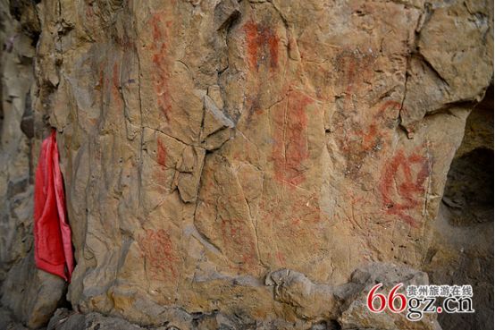 同时,在金山洞壁上的清代壁题也数量众多,既有题诗,又有纪事,还有祝文,分别题于清乾隆、道光、咸丰年间。明显可见“贵州贵阳府”和“贵阳府广顺州”等字样。还有1949年以后的毛主席语录,均以赭色书写。据说时至今日,仍有村民在岩下洞口焚香秉烛,寄拜岩神,祈祷康健。现在在岩石上还能看到祈福的红布和被烟火熏黑的岩洞。
