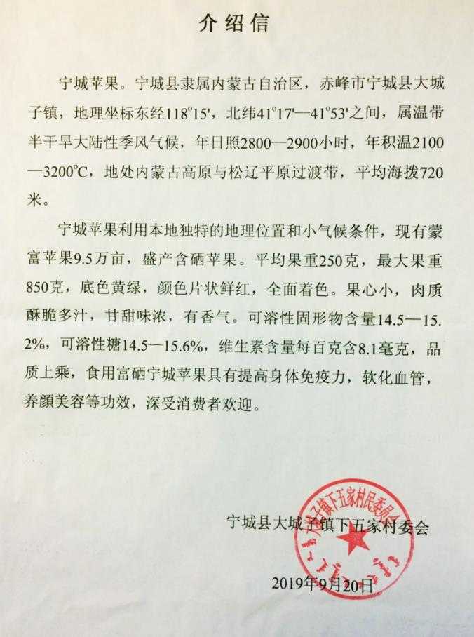 宁城苹果是宁城县巴林果树试验场与沈阳农业大学合作,于1978年以哈尔滨东光苹果为母本和日本富士苹果为父本杂交而来,经过十几年时间选育而成的苹果。1997年内蒙古自治区科学委员会组织国内著名果树专家进行鉴定,定名为蒙富,寓意内蒙古的富士。2015年7月“宁城苹果”通过国家工商总局商标局注册,取得“宁城苹果”地理标志证明商标,推动了本地苹果产业健康快速发展。