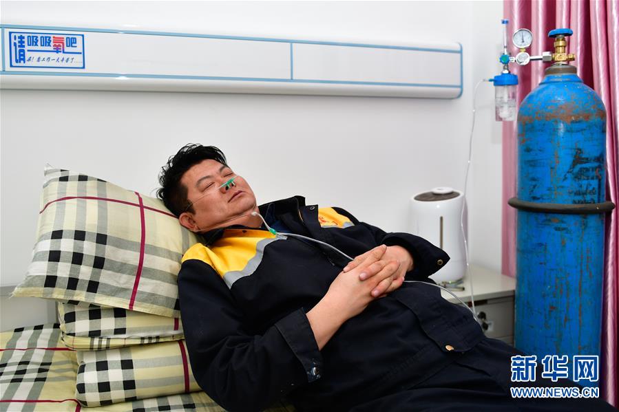 1月11日,在青藏铁路望昆站,于本蕃在宿舍里吸氧休息。(新华社记者张龙 摄影)